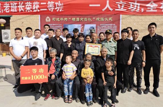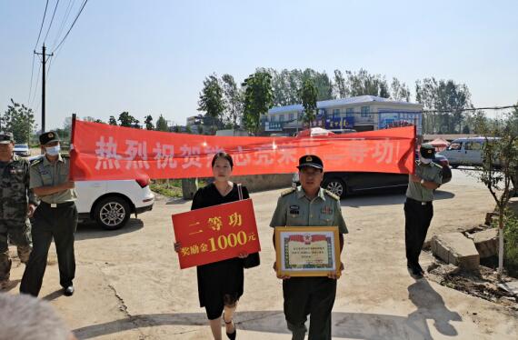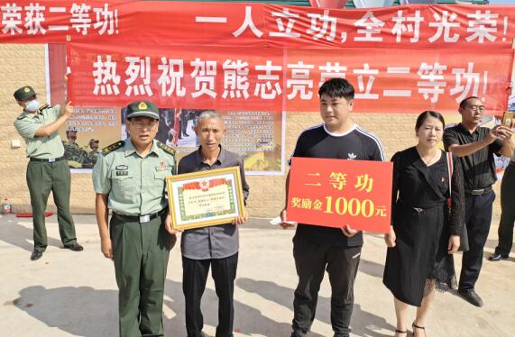 (李新建 劉建國(guó))9月18日,在這個(gè)特殊的日子,河南駐馬店正陽(yáng)縣慎水鄉(xiāng)王牌村熱鬧非凡、鑼鼓喧天,鞭炮齊鳴,中國(guó)人民武裝警察部隊(duì)獵鷹突擊隊(duì)特戰(zhàn)訓(xùn)練大隊(duì)對(duì)抗中隊(duì)中隊(duì)長(zhǎng)熊志亮家迎來(lái)了二等功軍章。在正陽(yáng)縣人民武部政委胡春雷的帶領(lǐng)下,縣軍人事務(wù)局領(lǐng)導(dǎo)和武警官兵一起,高舉“祝賀熊志亮同志榮立二等功”橫幅、二等軍功章牌匾和千元慰問(wèn)金送到家屬手中。