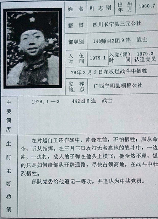 據(jù)了解,葉志剛烈士,四川省宜賓市長寧縣三元鄉(xiāng)人,1960年生,442團9連戰(zhàn)士,1979年3月在自衛(wèi)還擊保衛(wèi)邊疆作戰(zhàn)中英勇犧牲,年僅19歲。戰(zhàn)后部隊黨委給他追記一等功,追認為中國共產(chǎn)黨黨員。七九自衛(wèi)還擊保衛(wèi)邊疆作戰(zhàn)時,張長順將軍時任原成都軍區(qū)司令部軍訓部副部長,派駐148師工作組組長。戰(zhàn)后四十多年來,張將軍一直在牽掛著葉志剛烈士,一直在尋找烈士的親人,目的是為了兌現(xiàn)當初面對烈士遺體作出的一個承諾!