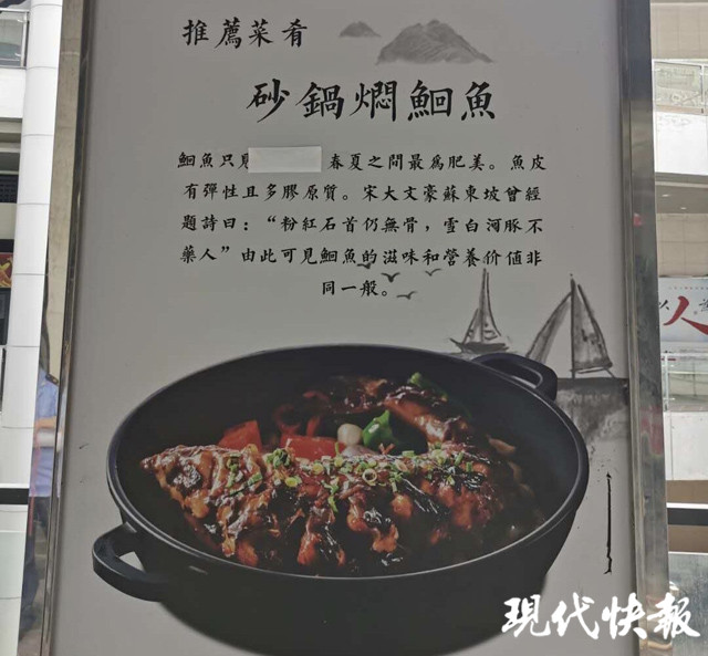 在秦淮區(qū)一家餐飲店,門口兩側(cè)矗立了多塊巨幅菜品廣告牌。雖然店家將廣告牌中出現(xiàn)的“江鮮”改成了“魚鮮”。但有的菜品宣傳文字仍有“長(zhǎng)江”等字樣。比如,該餐飲店的一道推薦菜品“砂鍋燜鮰魚”,在廣告牌的推薦語(yǔ)中就這樣寫道:鮰魚只見(jiàn)于長(zhǎng)江,春夏之間最為肥美……雖然未直接點(diǎn)名江鮮,但“鮰魚只見(jiàn)于長(zhǎng)江”的說(shuō)法,不免讓人產(chǎn)生聯(lián)想。對(duì)此,店家表示,這道菜原材料鮰魚為人工養(yǎng)殖,并未野生捕撈。
