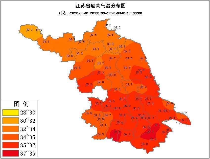 △8月2日江蘇最高氣溫 圖片來源:江蘇氣象