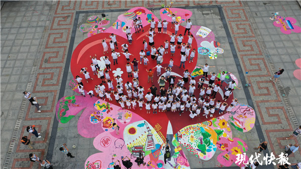 在太湖廣場(chǎng)活動(dòng)現(xiàn)場(chǎng),中央一個(gè)巨大的“雙愛心”,在藍(lán)天下顯得格外艷麗,周邊是散落的粉色花瓣,100余個(gè)家庭創(chuàng)作著各自“愛”的主題畫。有的畫的是彩虹、綠樹和紅花,表達(dá)的是對(duì)自然的愛;有的畫的是運(yùn)河、古鎮(zhèn),表達(dá)對(duì)家鄉(xiāng)的愛……