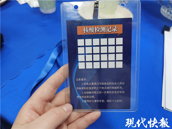 記者注意到,在上崗證的背面,清晰地標(biāo)注著從業(yè)人員的核酸檢測(cè)記錄。同時(shí),上面還有3條注意事項(xiàng),內(nèi)容是“所有從事進(jìn)口冷鏈?zhǔn)称返膹臉I(yè)人員必須每周到區(qū)指定的三個(gè)地點(diǎn)進(jìn)行核酸檢測(cè);在接觸貨物之前一定要檢查是否有南京倉(cāng)的出庫(kù)證明;要戴好口罩和手套,做好個(gè)人防護(hù)。”