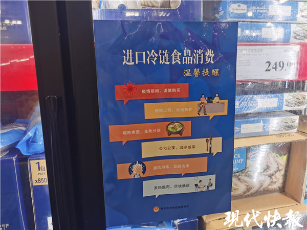 12月30日,現(xiàn)代快報(bào)記者來(lái)到南京市江北新區(qū)的一家連鎖超市,所有進(jìn)口冷鏈?zhǔn)称范即娣旁谝粋€(gè)單獨(dú)的冰柜里。記者注意到,冰柜上擺著一盒一次性手套供消費(fèi)者使用。此外,冰柜上還擺著一張由南京市市場(chǎng)監(jiān)督管理局出示的進(jìn)口冷鏈?zhǔn)称废M(fèi)提示。提示旁邊,還有個(gè)文件架,專門(mén)用來(lái)儲(chǔ)存冷鏈?zhǔn)称废嚓P(guān)證明和核酸檢測(cè)報(bào)告。