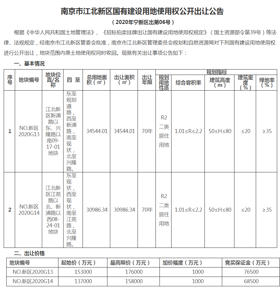 8月26日,南京市江北新區(qū)國(guó)有建設(shè)用地使用權(quán)公開(kāi)出讓公告(2020年寧新區(qū)出第06號(hào))發(fā)布,江北新區(qū)核心區(qū)兩幅住宅用地亮相。新區(qū)G13是江北新區(qū)新浦路以東、興隆路以南09-17-01地塊,另一幅新區(qū)G14是江北新區(qū)江苑路以北、新浦路以西08-24-01地塊,兩幅地塊相鄰,僅隔一條新浦路,出讓面積也都是3萬(wàn)多㎡,二類(lèi)居住用地。