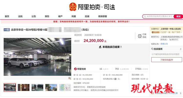 司法拍賣(mài)頁(yè)面顯示,甘薇所持有的該套房產(chǎn),建筑面積為193.59平方米,登記時(shí)間為2017年5月31日。該套房產(chǎn)的市場(chǎng)評(píng)估價(jià)為2206萬(wàn)元,起拍價(jià)為1545萬(wàn)元。參與競(jìng)拍的競(jìng)買(mǎi)人需繳納保證金155萬(wàn)元。值得注意的是,上述標(biāo)的拍賣(mài)成交后,泛海國(guó)際蘭海園一個(gè)地下車(chē)位也同時(shí)成交,拍賣(mài)成交價(jià)款包含47萬(wàn)元車(chē)位成交價(jià)款。