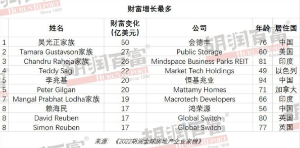 57位房地產(chǎn)企業(yè)家財富比去年增長,其中增長最多的是來自中國的會德豐76歲吳光正,增長了300億元;其次是美國Public Storage 60歲的Tamara Gustavson,增長了200億元。