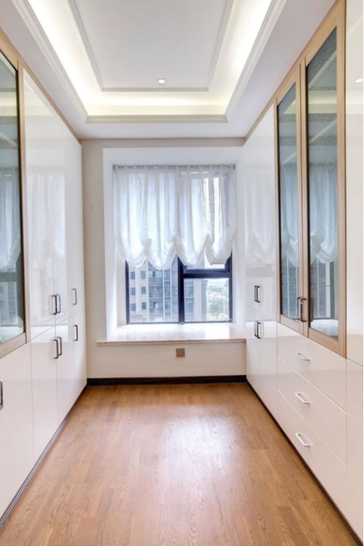 在沒有飄窗的戶型中,如果窗戶旁邊的空間又是比較寬裕的,就可以在靠窗位置裝上一排的飄窗,然后把飄窗兩側的空間也做成收納柜利用起來。這樣靠窗也能安裝定制柜,還不會讓柜子遮擋窗戶、影響空間的采光與通風。