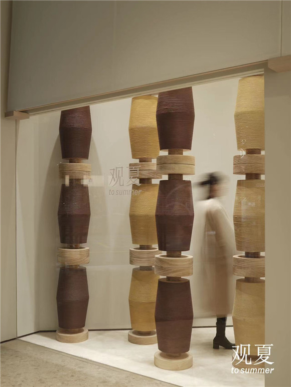 觀夏云坊的空間設(shè)計(jì)靈感來源于匠人創(chuàng)作云錦的過程,用空間之美講述一絲一線編織而成的故事。云錦織布機(jī)體型高大,需要一對云錦匠人同時(shí)親密合作才能運(yùn)轉(zhuǎn),織布機(jī)上的絲線和織物要經(jīng)過很多雙手的反復(fù)觸摸,最終才能成為一件在古代只有皇室才能使用的藝術(shù)品。觀夏云坊外立面裝飾的木棍和棉線,意在模擬織布機(jī)的結(jié)構(gòu)。云錦織布機(jī)的構(gòu)造很特殊,工匠們在編織時(shí)只能看到云錦背面的經(jīng)緯走勢,也就是“織造”的過程。