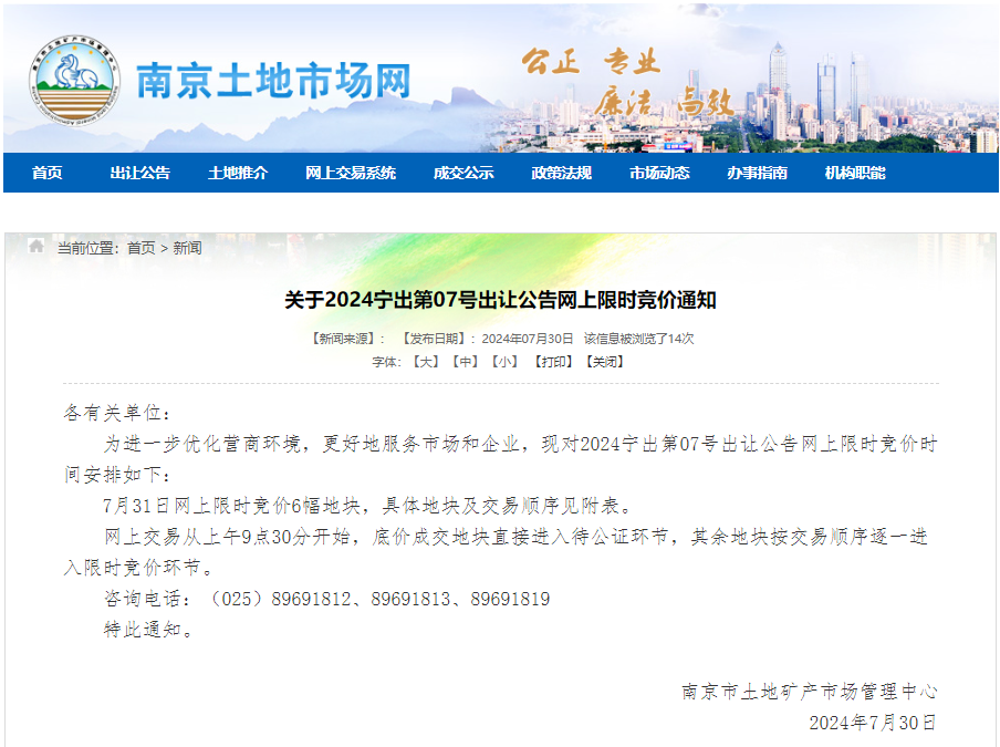 7月30日,南京土地市場網(wǎng)發(fā)布“關于2024寧出第07號出讓公告網(wǎng)上限時競價通知”,于明天出讓的6幅住宅用地競價順序出爐。