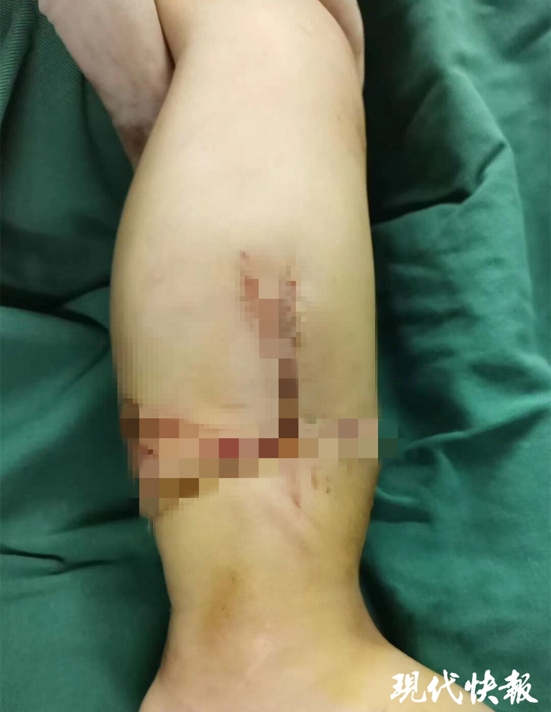 “家長鞋都沒有穿就抱著孩子來了,情況非常緊急。孩子右小腿裹著紗布,做過簡單包扎。打開一看傷口觸目驚心,是一個大的L形的傷口,皮下一直拉到肌腱層,向后方撕開,脂肪和肌腱外露。”看到如此嚴(yán)重的傷口,接診的淮安市婦幼保健院小兒外科主治醫(yī)師王挺表示嚇了一跳。“原來,家人在農(nóng)忙的時候,電動三輪車停放在田邊,三輪車當(dāng)時還處于一個可以行駛的狀態(tài),孩子爬了上去啟動了三輪車,造成三輪車急加速發(fā)生旋轉(zhuǎn)然后翻車,孩子右小腿被銳器直接撕開。”王挺說。