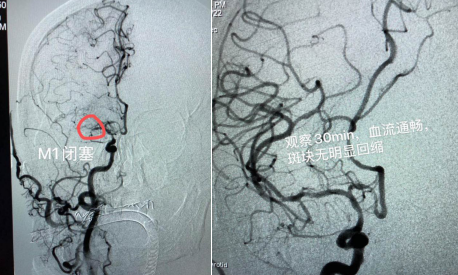 該患者男性,69歲,既往有高血壓、糖尿病、腦梗死等病史;主因“突發(fā)左側(cè)肢體活動(dòng)障礙5小時(shí)”入院;患者入院時(shí)神志嗜睡,煩躁不安,言語(yǔ)含糊,雙側(cè)眼球向右側(cè)凝視,雙側(cè)瞳孔等大、等圓,對(duì)光反射( + );左側(cè)中樞性面舌癱;左側(cè)肢體肌力0級(jí),右側(cè)肢體肌力5級(jí), NIHSS評(píng)分15分。入院后,立即啟動(dòng)卒中綠色通道,在頭顱CT排除腦出血后,進(jìn)行急診頭顱MRI+MRA檢查:右側(cè)顳葉梗死,右側(cè)大腦中動(dòng)脈閉塞。為進(jìn)一步明確病因,決定對(duì)患者實(shí)施腦血管造影+備支架機(jī)械取栓術(shù),盡最大努力挽救患者生命。時(shí)間就是生命!腦病科丁煜主任緊急與患者家屬溝通病情,取得了家屬的同意。在急診科、放射科、麻醉科、重癥監(jiān)護(hù)室、檢驗(yàn)科等多學(xué)科協(xié)作下,以腦病科邢錫熙主治醫(yī)師為首的神經(jīng)介入治療組迅速完成術(shù)前準(zhǔn)備,于入院內(nèi)1小時(shí)進(jìn)入導(dǎo)管室穿刺造影,發(fā)現(xiàn)患者右側(cè)大腦中動(dòng)脈M1遠(yuǎn)端閉塞,遂行支架機(jī)械取栓術(shù),一次性開(kāi)通血管;發(fā)現(xiàn)大腦中動(dòng)脈重度狹窄,在藥物維持血流無(wú)效的情況下,當(dāng)機(jī)立斷行球囊擴(kuò)張,血管順利3級(jí)開(kāi)通,觀察半小時(shí)血流通暢。