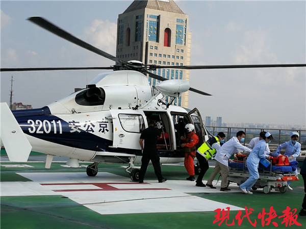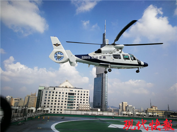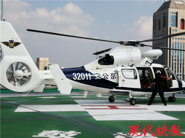 120調(diào)度指揮中心立即啟動整個航空醫(yī)療救護流程,與南京市公安局特警支隊警務(wù)飛行大隊、南京鼓樓醫(yī)院和110指揮中心等單位取得聯(lián)系。10分鐘后,一架警用直升機趕到指定位置,同時,公安分隊、地面急救人員也趕到指定位置,艙門開啟,從艙內(nèi)快速走出兩名航空醫(yī)療急救人員。地面等待的急救人員快速上前,協(xié)助機上醫(yī)護人員將已現(xiàn)場心肺復(fù)蘇成功的患者轉(zhuǎn)移到直升機上,直升機起飛后,航空醫(yī)療急救人員通過院前院內(nèi)一體化信息共享平臺及時向鼓樓醫(yī)院傳輸“患者”信息,暢通院前院內(nèi)一體化綠色通道,整個演練僅用時32分鐘,為患者爭取了寶貴的救治時間。