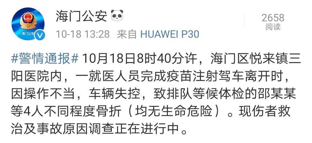 當(dāng)日,海門公安通過官方微博發(fā)布警情通報。通報內(nèi)容顯示,10月18日8時40分許,海門區(qū)悅來鎮(zhèn)三陽醫(yī)院內(nèi),一就醫(yī)人員完成疫苗注射駕車離開時,因操作不當(dāng),車輛失控,致排隊等候體檢的邵某某等4人不同程度骨折(均無生命危險)。目前傷者救治及事故原因調(diào)查正在進(jìn)行中。