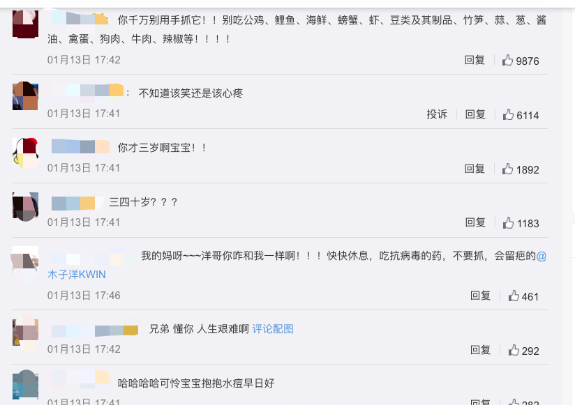 在評論區(qū),粉絲們也是操碎了心。有的提醒木子洋要忌口,有的表達了早日康復(fù)的祝愿,也有的說感同身受,因為自己也起了水痘,當(dāng)然也有粉絲不厚道,重點竟然放在了“三四十歲”的年紀上……