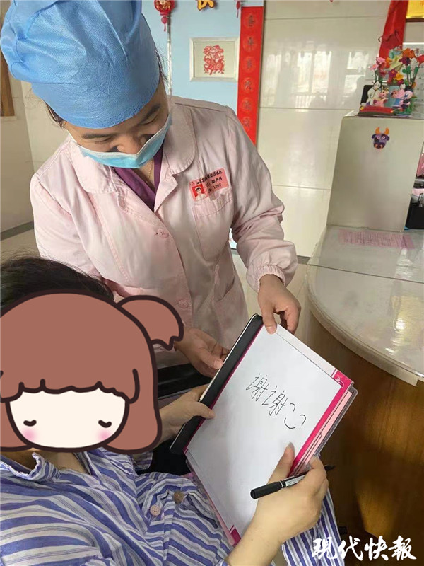 用眼神和紙筆進(jìn)行特殊又溫暖的“對(duì)話(huà)”,給了胡女士很大的信心,順利誕下一名女寶寶。“分娩完非常激動(dòng),她自己不會(huì)寫(xiě)字,為了表達(dá)自己的謝意,所以她就照著手機(jī)寫(xiě)了謝謝兩個(gè)字來(lái)感謝我們,還畫(huà)了一個(gè)笑臉,這個(gè)新年禮物讓我倍感溫暖,雖然是無(wú)聲的,但也讓我有了滿(mǎn)滿(mǎn)的職業(yè)自豪。”邵丹丹說(shuō)。