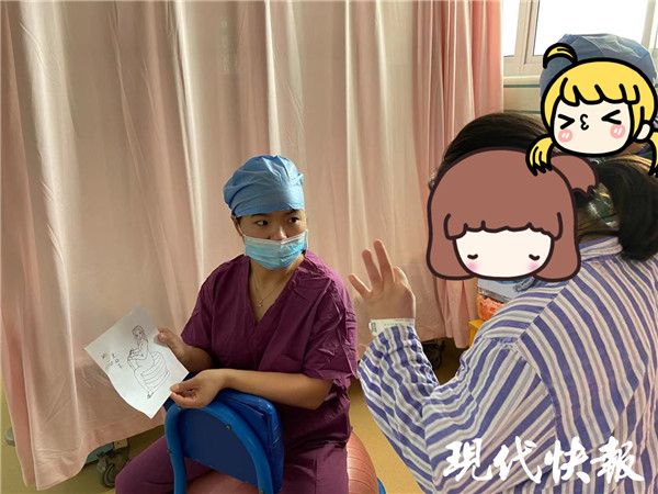 當(dāng)天下午,胡女士進(jìn)入產(chǎn)房待產(chǎn),由于她的情況特殊,產(chǎn)房工作人員對(duì)她格外關(guān)照。“因?yàn)樗莻€(gè)聾啞人,陪伴她旁邊的婆婆只會(huì)一些簡(jiǎn)單的手語(yǔ),但是產(chǎn)程中需要的特殊用語(yǔ)她都無(wú)法表達(dá)出來(lái),這就給我們生產(chǎn)過(guò)程造成很多困難。”淮安市婦幼保健院產(chǎn)房助產(chǎn)士邵丹丹說(shuō),平時(shí)工作中接觸聾啞產(chǎn)婦的機(jī)會(huì)并不多,她就琢磨著文字進(jìn)行交流,但是同事和胡女士家人進(jìn)一步溝通又發(fā)現(xiàn)了新的困難。