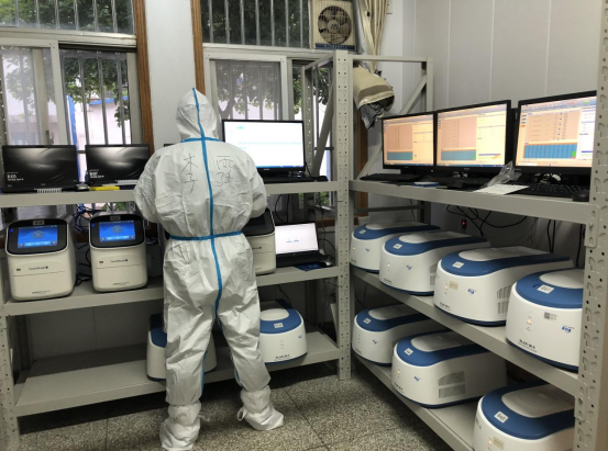 對大多數(shù)普通群眾而言,核酸檢測只需幾秒鐘就可完成,但對檢驗人員來說,這項工作才剛剛開始。每一份標(biāo)本送到核酸檢測實驗室,都需要經(jīng)過實驗室一區(qū)的標(biāo)本接收、數(shù)量統(tǒng)計、信息核對、分檢、編號、標(biāo)本處理,調(diào)配試劑到實驗室二區(qū)的核酸提取,再到三區(qū)的擴增、結(jié)果分析、上傳數(shù)據(jù)……一系列復(fù)雜耗時的過程,加上長時間戴著雙層乳膠手套、成千上萬次的擰蓋加樣,這些都讓磨破手皮、手腳抽筋的情況變成實驗室每一位醫(yī)護人員的工作常態(tài)。隨時接收來自封控區(qū)和高速卡點等高風(fēng)險區(qū)的標(biāo)本,工作在離病毒最近的地方,面臨著巨大的風(fēng)險,包括李霆在內(nèi)的檢驗人員從來沒有退縮,而是努力克服心理和生理壓力,奮戰(zhàn)在這個幕后的偉大崗位上。他們每日穿著防護服不吃不喝連續(xù)工作6-8小時,24小時輪班,夜以繼日的不懈堅守,超負(fù)荷完成了高于平常幾倍的檢測工作量。正因為他們的堅守,才使得一輪又一輪的全員核酸檢測工作有條不紊的進行。