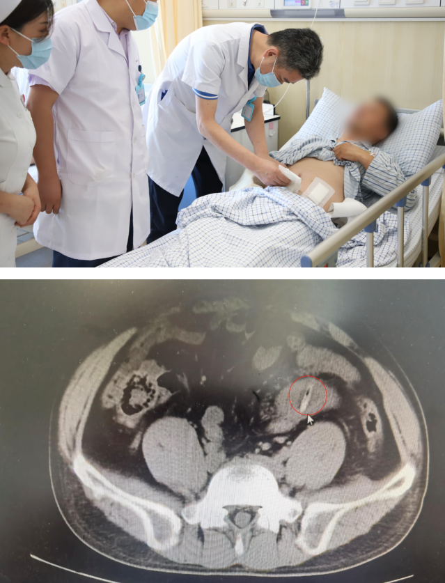 當(dāng)天晚上,王先生出現(xiàn)了腹痛,本以為是腎結(jié)石發(fā)作了。由于疼痛難忍,第二天凌晨被家人緊急送到南京市江寧醫(yī)院急診科,入院后患者的腹膜刺激征明顯,并且疼痛持續(xù)較重。腹部CT平掃檢查顯示,左下腹腸腔內(nèi)高密度影伴鄰近少許游離氣體,異物伴消化道穿孔。普外科會診后,考慮患者需入院治療,擬以“急性彌漫性腹膜炎”收住入院。
