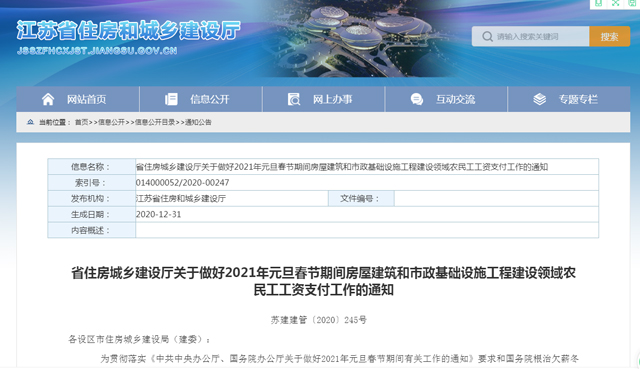 (實(shí)習(xí)生 黃鈺曄 記者 張瑜)近日,江蘇省住房和城鄉(xiāng)建設(shè)廳發(fā)布《關(guān)于做好2021年元旦春節(jié)期間房屋建筑和市政基礎(chǔ)設(shè)施工程建設(shè)領(lǐng)域農(nóng)民工工資支付工作的通知》(以下簡稱《通知》),要求各地切實(shí)做好元旦春節(jié)期間農(nóng)民工工資支付工作,保障農(nóng)民工合法權(quán)益。《通知》明確,加大拖欠工程款和工資查處力度,對不主動落實(shí)、不積極配合有關(guān)部門解決拖欠農(nóng)民工工資問題,引發(fā)群體性事件并造成嚴(yán)重后果的有關(guān)單位和責(zé)任人,要進(jìn)行約談、通報(bào)和問責(zé)。