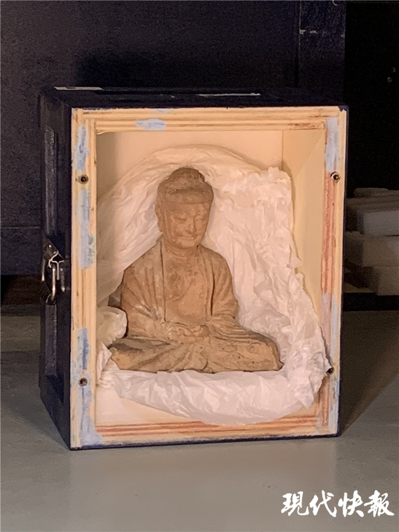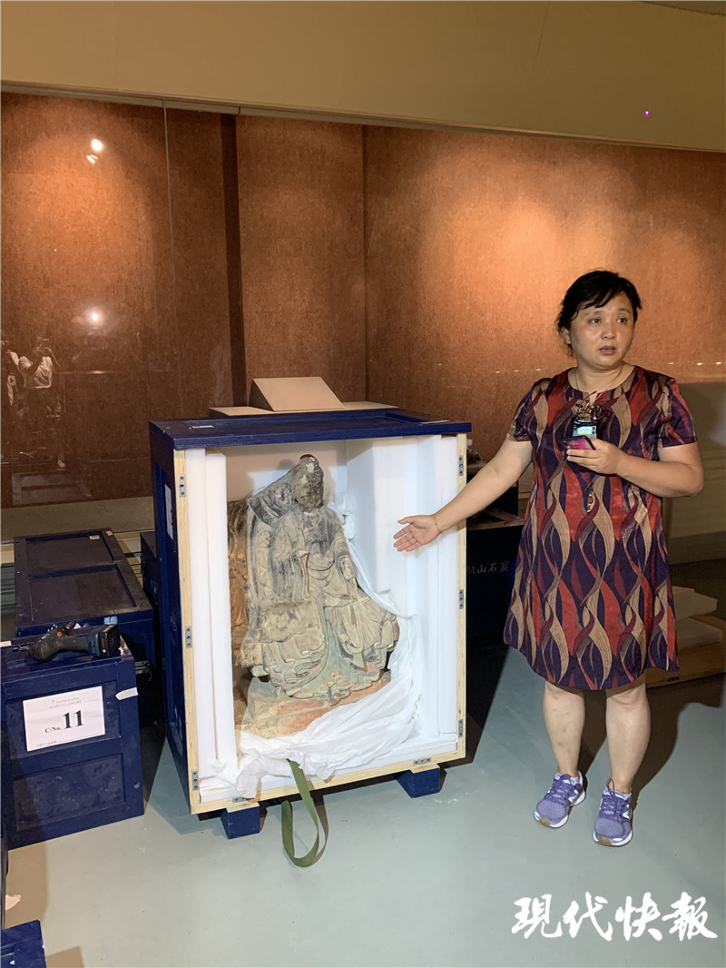 記者發(fā)現(xiàn),展廳里堆滿了大大小小的箱子,李威介紹,這100多個(gè)箱子是由3輛高9米6的大貨車,從麥積山運(yùn)往常州博物館的。“光是卸貨就用了一天半的時(shí)間,因?yàn)槔锩嬗泻芏辔奈?,我們必須小心翼翼,不能有任何閃失。”
