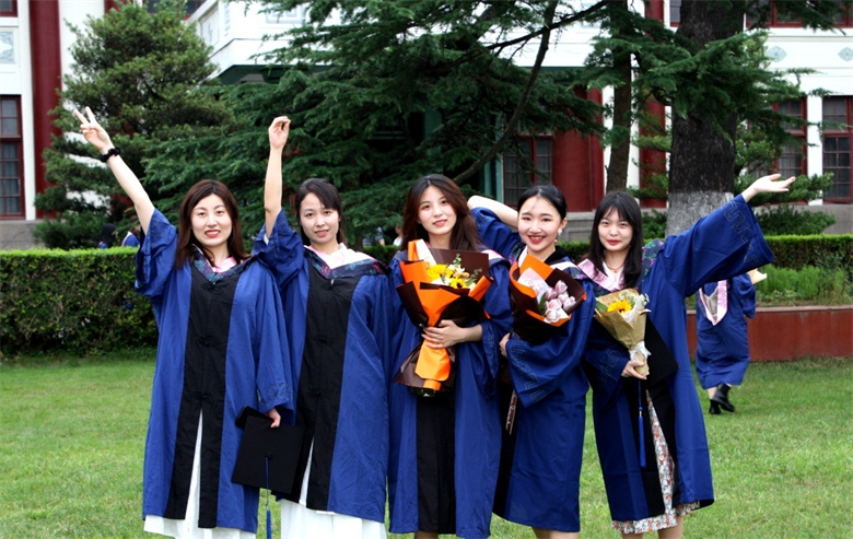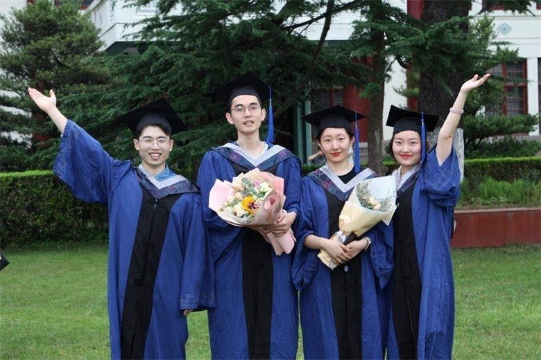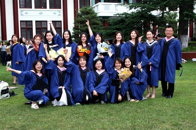 校園教學(xué)樓前獲得博士學(xué)位的畢業(yè)生合影留念