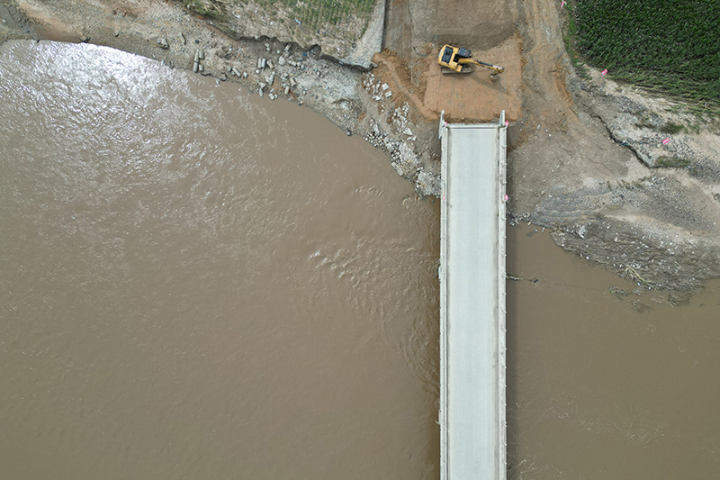 8月11日,工作人員在黑龍江省尚志市馬延鄉(xiāng)馬延大橋搶修現(xiàn)場(chǎng)進(jìn)行施工作業(yè)(無人機(jī)照片)。新華社記者 張濤 攝