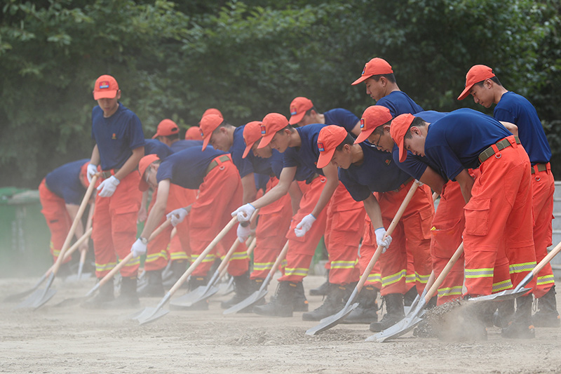 8月11日,在黑龍江省尚志市東浦公館小區(qū)附近,哈爾濱市森林消防支隊(duì)的消防員在清理道路。新華社記者 張濤 攝