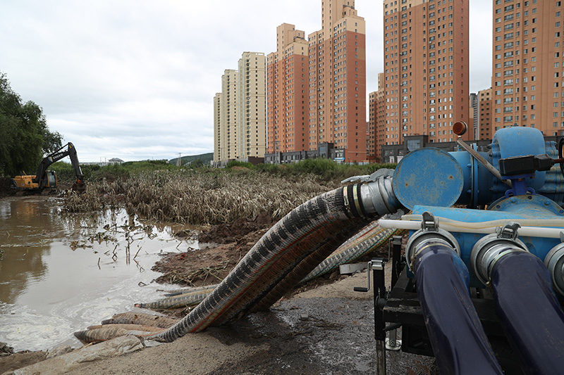8月11日,在黑龍江省尚志市尚志鎮(zhèn)的一處積水農(nóng)田,工作人員在進(jìn)行排水作業(yè)。