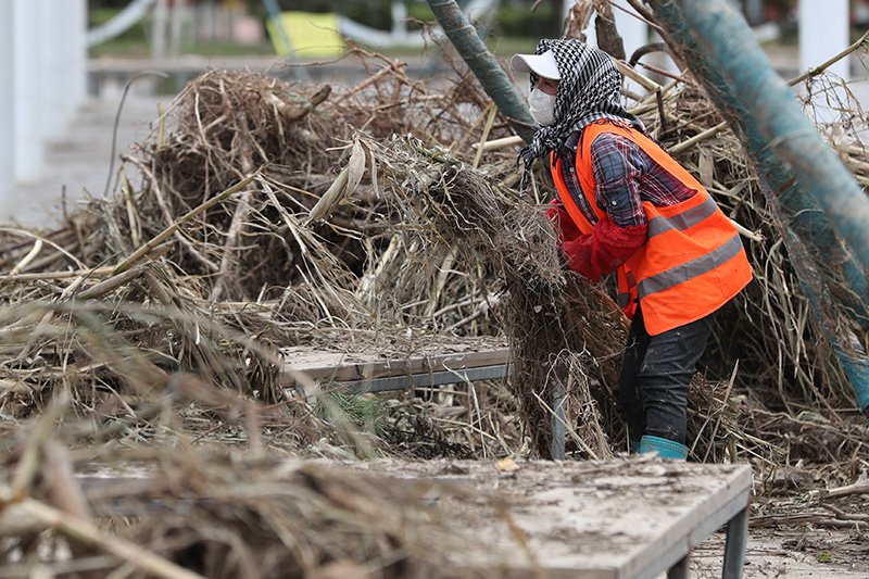 8月11日,在黑龍江省尚志市尚志大街附近,環(huán)衛(wèi)工人在清理洪水沖來的雜物。 張濤 攝