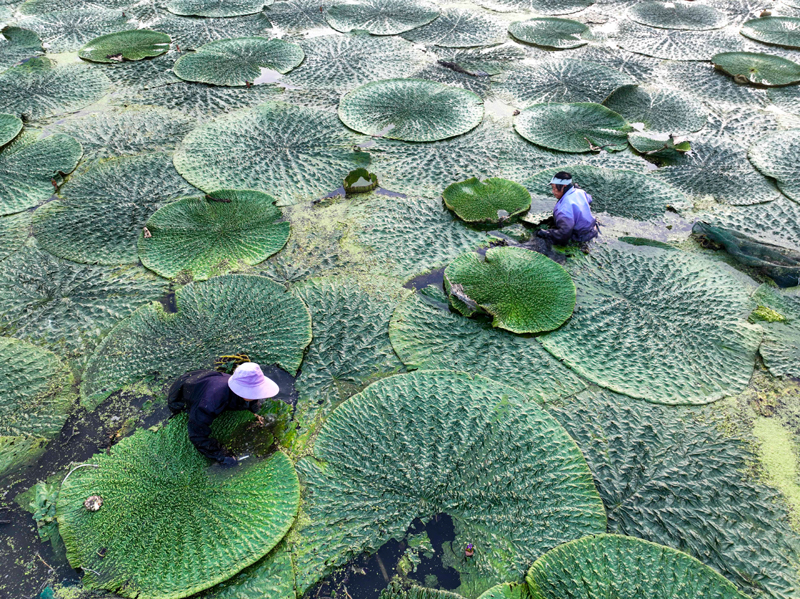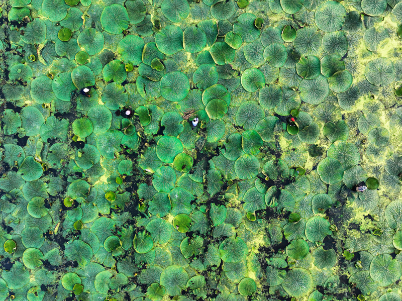 8月18日,泰州市姜堰區(qū)申俞村農(nóng)民在采收芡實(無人機照片)。新華社發(fā)(顧繼紅 攝)