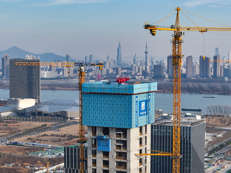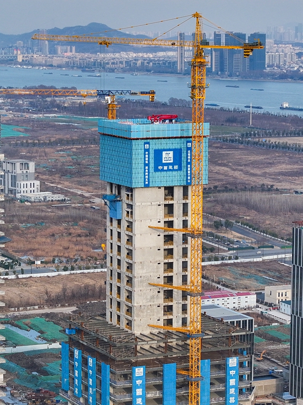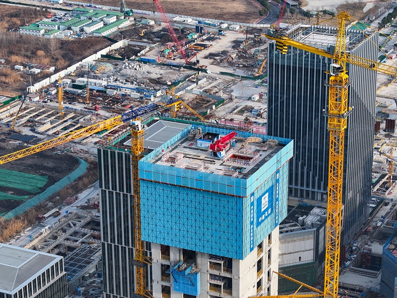 當(dāng)日,在江蘇省南京市江北新金融中心一期項(xiàng)目施工現(xiàn)場,承建方中建三局運(yùn)用“空中造樓機(jī)”進(jìn)行項(xiàng)目封頂前的最后一次頂升作業(yè),各項(xiàng)施工穩(wěn)步推進(jìn)。據(jù)介紹,該項(xiàng)目建造采用智能集成“空中造樓機(jī)”,提高了高層建筑施工的機(jī)械化、智能化及綠色施工水平,讓“高空作業(yè)”變?yōu)椤笆覂?nèi)施工”,施工效能提升約20%。