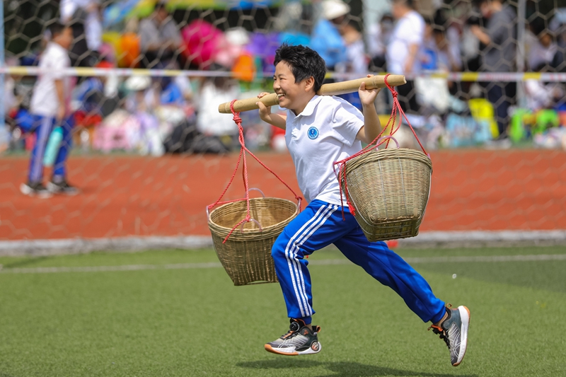 4月28日,在山東省青島市城陽區(qū)第二實驗小學(xué),學(xué)生進(jìn)行“挑扁擔(dān)”趣味運動比賽。新華社發(fā)(張鷹?攝)