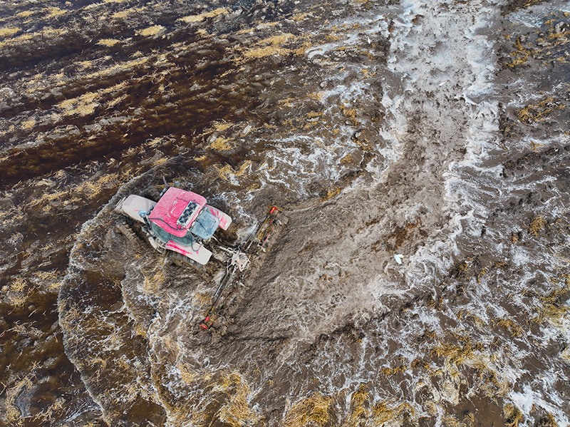 6月18日,農(nóng)業(yè)機械在臨海農(nóng)場一塊水田進行起漿作業(yè)(無人機照片)。新華社記者 季春鵬 攝