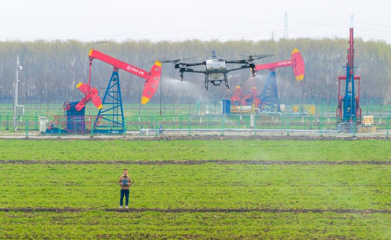 3月5日,在江蘇省興化市陳堡鎮(zhèn)蔡堡村,種植戶使用植保無人機為小麥?zhǔn)┓省? 當(dāng)日是驚蟄,各地農(nóng)民搶抓農(nóng)時,田間地頭一派忙碌景象。 新華社發(fā)(周社根 攝)