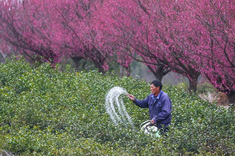 3月5日,茶農(nóng)在江蘇省句容市后白鎮(zhèn)西馮村一處茶園里施肥。 當(dāng)日是驚蟄,各地農(nóng)民搶抓農(nóng)時,田間地頭一派忙碌景象。 新華社發(fā)(鐘學(xué)滿 攝)