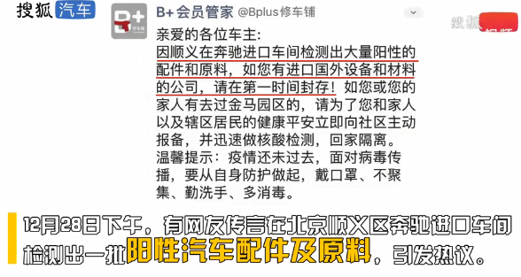 12月28日,有網(wǎng)友傳出在北京順義區(qū)奔馳車間檢測(cè)出一批陽性汽車配件及原料。12月29日,搜狐汽車 · 汽車咖啡館致電北京順義區(qū)部分4S店,得到的答復(fù)均是以官方消息為準(zhǔn)。不過北京亞奧之星表示目前店面正在消殺,但之后還可以繼續(xù)試駕和買車。另外兩家4S店也表示目前可以進(jìn)行試駕和預(yù)購,店面消殺不影響銷售。