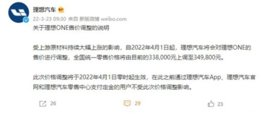 一方面,理想ONE在4月份進行了一次大幅度的調價,價格上漲幅度達到了1萬多,由于原材料價格上漲,幾乎所有新能源車型都在漲價,這其實可以理解。在理想汽車針對價格上漲的原因作出的回復中也表示,電池原材料成本上調導致價格上漲是最大的因素。 不過理想ONE作為增程式電動汽車,其實使用的電池包容量并不是很大,1萬多的漲價幅度著實有些夸張了。而且理想汽車在3月23日宣布, 4月1日起就迫不及待正式漲價了。