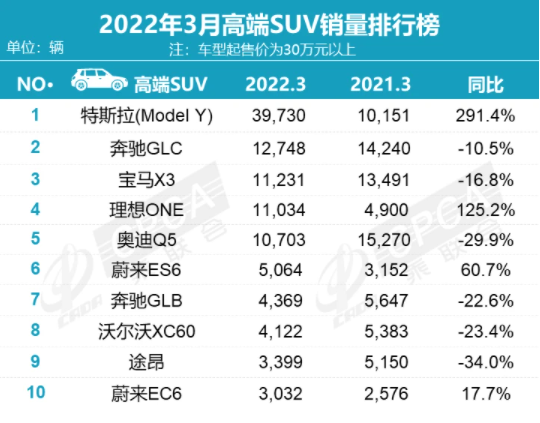 乘聯(lián)會統(tǒng)計的一季度銷量數(shù)據(jù)中,3月高端SUV(起售價30萬元以上)銷量榜:Model Y以近4萬輛的銷量奪冠,燃油車型集體下滑。此外,理想ONE、蔚來ES6、蔚來EC6躋身3月高端SUV銷量的前十,且同比均呈現(xiàn)正增長。在高端轎車方面,雖然前十名的排行中沒有新能源汽車的身影,除了寶馬5系、奔馳E級與捷豹XFL以外,其他車型銷量均呈現(xiàn)不同程度的同比下降。