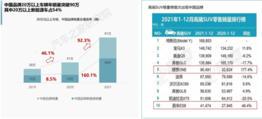 價格是支撐中國品牌向上的基石,隨著中國品牌持續(xù)向高端化進軍,豪華車市場逐漸有了中國品牌的身影。汽車之家研究院統(tǒng)計數(shù)據(jù)顯示,2021年,中國品牌20萬以上車輛年銷量突破90萬輛。其中,20萬元以上的中國品牌新能源汽車占比達54%