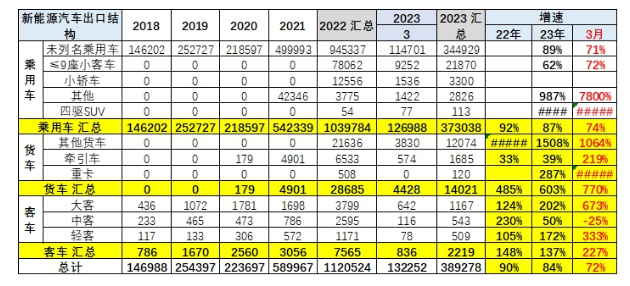 乘聯(lián)會統(tǒng)計口徑的數(shù)據(jù)顯示,2020年新能源車出口22.4萬臺;2021年新能源車出口59萬臺,繼續(xù)持續(xù)走強;2022年累計出口新能源車112萬臺;2023年1-3月出口新能源車39萬臺,同比增長84%,其中新能源乘用車出口37.3萬臺,同比增長87%,占比新能源汽車出口的95%。新能源專用車的出口也增長較快。