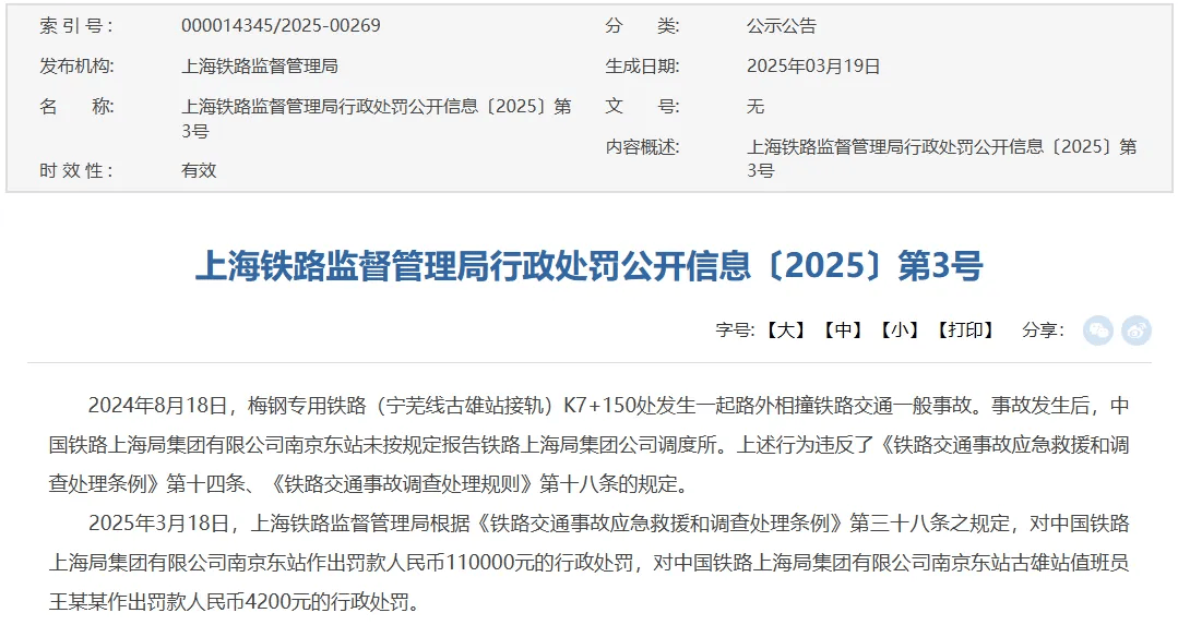 近日,國(guó)家鐵路局官網(wǎng)發(fā)布《上海鐵路監(jiān)督管理局行政處罰公開(kāi)信息》。通報(bào)顯示,2024年8月18日,梅鋼專用鐵路(寧蕪線古雄站接軌)K7+150處發(fā)生一起路外相撞鐵路交通一般事故。事故發(fā)生后,中國(guó)鐵路上海局集團(tuán)有限公司南京東站未按規(guī)定報(bào)告鐵路上海局集團(tuán)公司調(diào)度所。上述行為違反了《鐵路交通事故應(yīng)急救援和調(diào)查處理?xiàng)l例》第十四條、《鐵路交通事故調(diào)查處理規(guī)則》第十八條的規(guī)定。