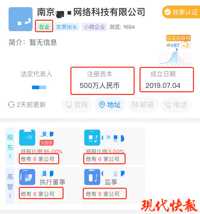 現(xiàn)代快報(bào)記者通過天眼查輸入這些涉事學(xué)生姓名發(fā)現(xiàn),這些被注冊(cè)的公司大多為網(wǎng)絡(luò)科技、人力資源、物流運(yùn)輸?shù)刃∥⑵髽I(yè)。注冊(cè)資本皆為500萬元。注冊(cè)時(shí)間集中在2019年5月至8月之間。這些企業(yè)有股份公司,也有獨(dú)資公司,涉事學(xué)生之間還互相兼任公司股東、執(zhí)行董事、高管等職位,形成了一個(gè)龐大的關(guān)系網(wǎng)絡(luò)。而且,絕大部分公司目前仍處于在業(yè)狀態(tài)。