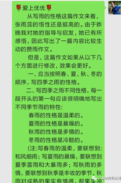 第二天,張心蕊在我的啟發(fā)之下寫出了《雨的性格》,她媽媽將這篇作文發(fā)到了我的微信中。