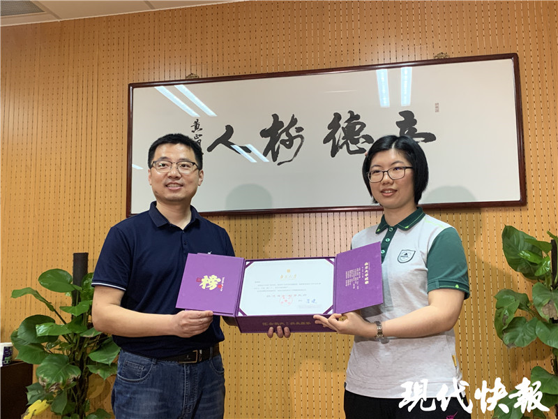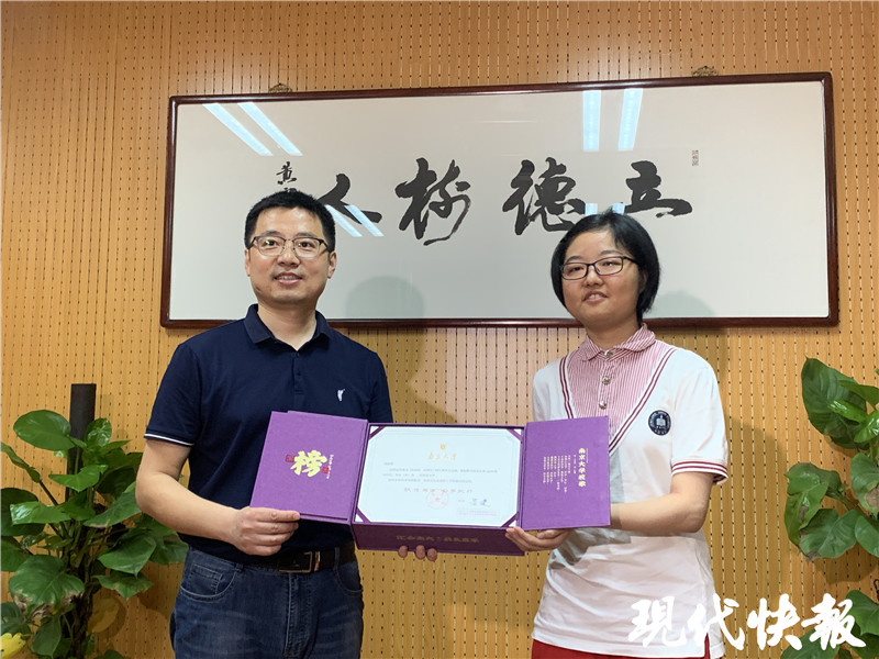 △南大本科招辦主任李浩為周琳琦(右)頒發(fā)錄取通知書