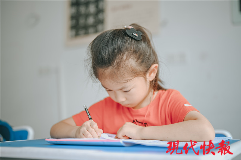 現(xiàn)代快報(bào)記者來(lái)到現(xiàn)場(chǎng),只見(jiàn)一名穿著紅衣服的小女孩非常顯眼。她端坐在書(shū)桌前,一筆一畫(huà)寫(xiě)著唐詩(shī)。“我很喜歡寫(xiě)字,每天回家也會(huì)練字一個(gè)小時(shí)。”這個(gè)叫黃舒涵的小朋友說(shuō)到書(shū)法,露出了開(kāi)心的笑容。