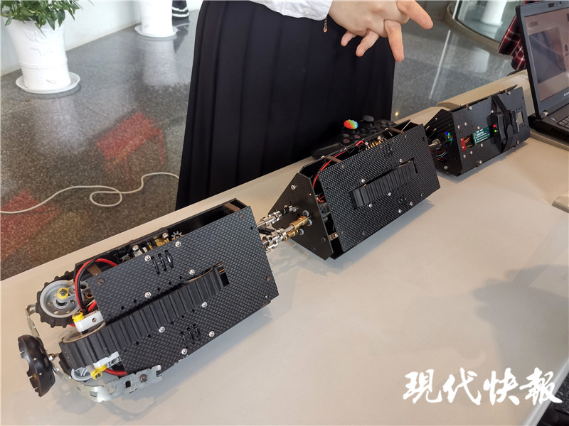 陳曹雨凡研發(fā)的一種面向復(fù)雜地形的多段組合式蛇形搜救機(jī)器人則堪稱“高大上”,能在礦井、深山等復(fù)雜地形進(jìn)行搜救。這款機(jī)器人有三棱柱式的行進(jìn)模塊,每面都有履帶,可與地面接觸,穩(wěn)定前行。此外,通過調(diào)節(jié)關(guān)節(jié)角度,能改變它的形態(tài),翻越較高障礙。同時(shí),它還攜帶攝像頭以及紅外線探測(cè)設(shè)備。