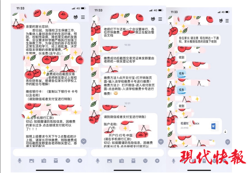 現(xiàn)代快報(bào)記者從常州市反詐騙中心了解到,8月28日,黃先生向派出所報(bào)案稱,QQ班級(jí)群內(nèi)“班主任”發(fā)布通知稱新學(xué)期要交費(fèi),包含學(xué)雜費(fèi)、伙食費(fèi)、保教管理費(fèi)等,需要按照通知要求操作付款并截圖發(fā)給老師統(tǒng)計(jì),群里另一位老師也出言附和。