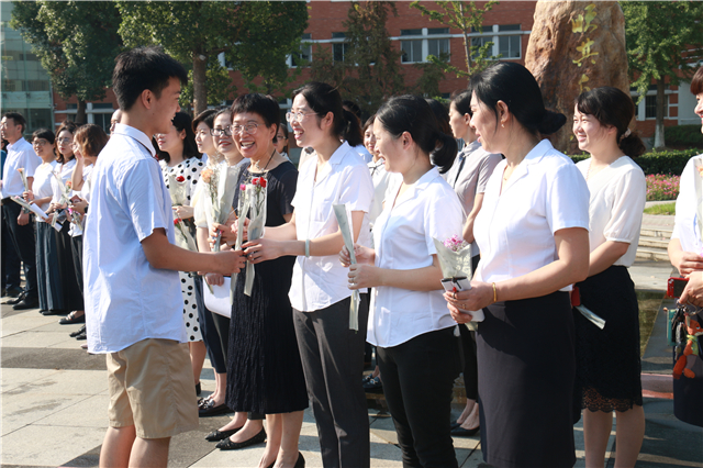 在中學(xué)部的晨會上,伴隨著《長大后我就成了你》的動人音樂,張文寒老師、竇靖老師、施宸老師和鐘欣老師,分別為當(dāng)年的班主任張玉東校長、魏謙老師、徐福剛老師、陳環(huán)老師獻上鮮花,這份愛的傳承令在場的每一位師生都十分感動。
