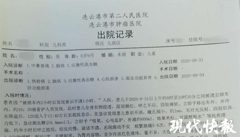 醫(yī)院診斷報告顯示,文文和瑞瑞于8點至10點30分之間被鎖車內。被發(fā)現(xiàn)時,兩個孩子“全身衣物濕透,面部潮紅,呼之不應,四肢癱軟”。其中,哥哥文文被診斷患有熱射病、腦病和應激性高血糖。弟弟瑞瑞的狀況則較為嚴重,且持續(xù)昏迷不醒。醫(yī)生當場就開出了兩份病危通知書。