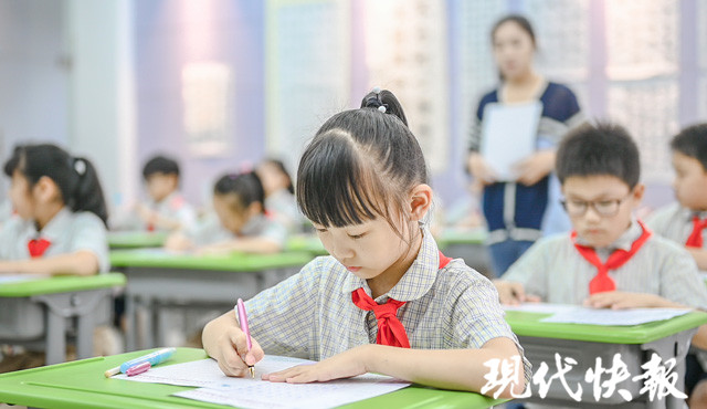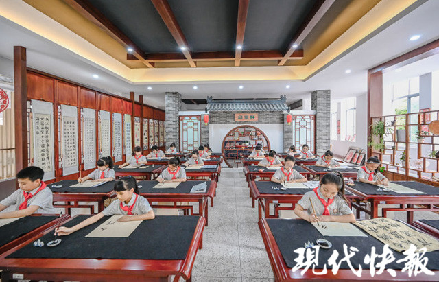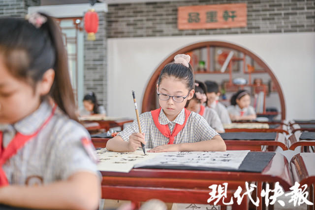“品墨軒”是學(xué)校書法教室的名字,下午兩點(diǎn)半,比賽正式開始?,F(xiàn)代快報記者在現(xiàn)場看到,墻上掛滿了歷屆學(xué)生的優(yōu)秀作品,教室布置充滿書法文化韻味,孩子們坐姿端正,用心書寫著每一個筆畫、每一個漢字,表現(xiàn)出良好的書寫習(xí)慣。